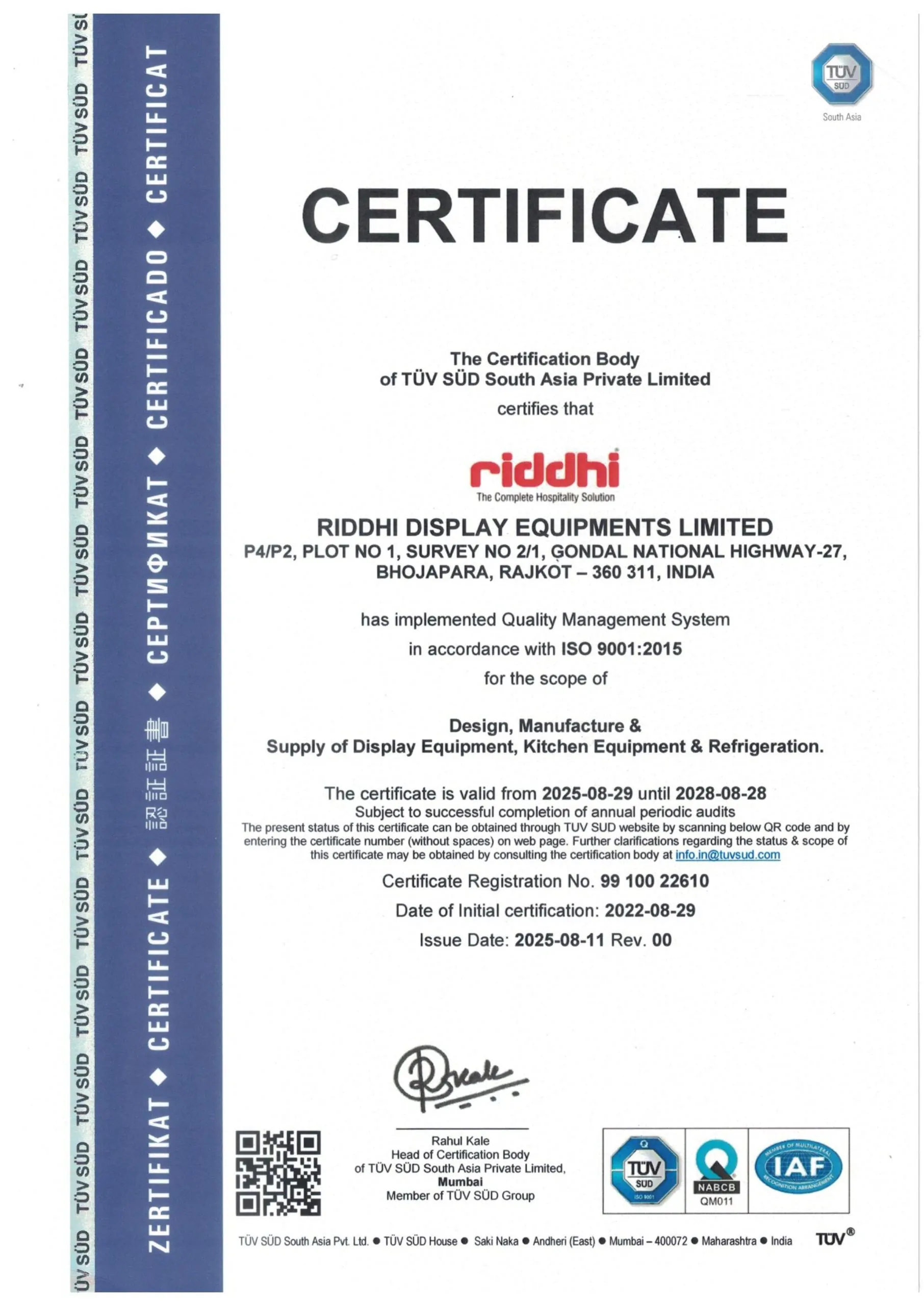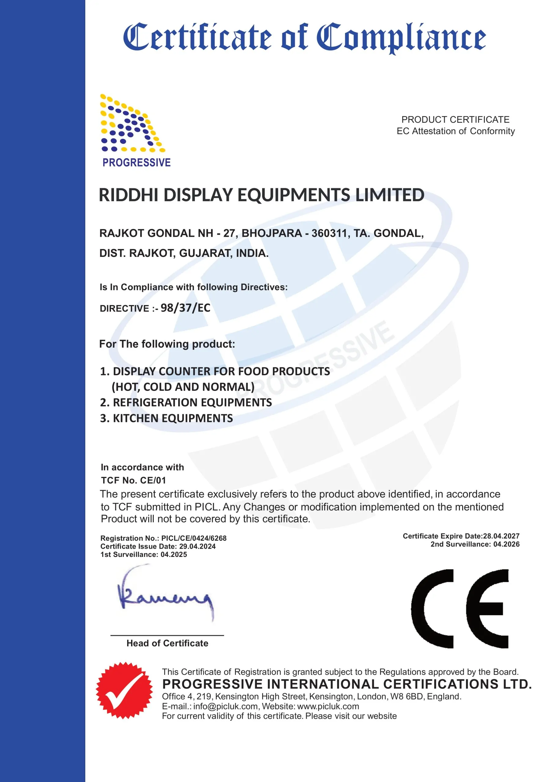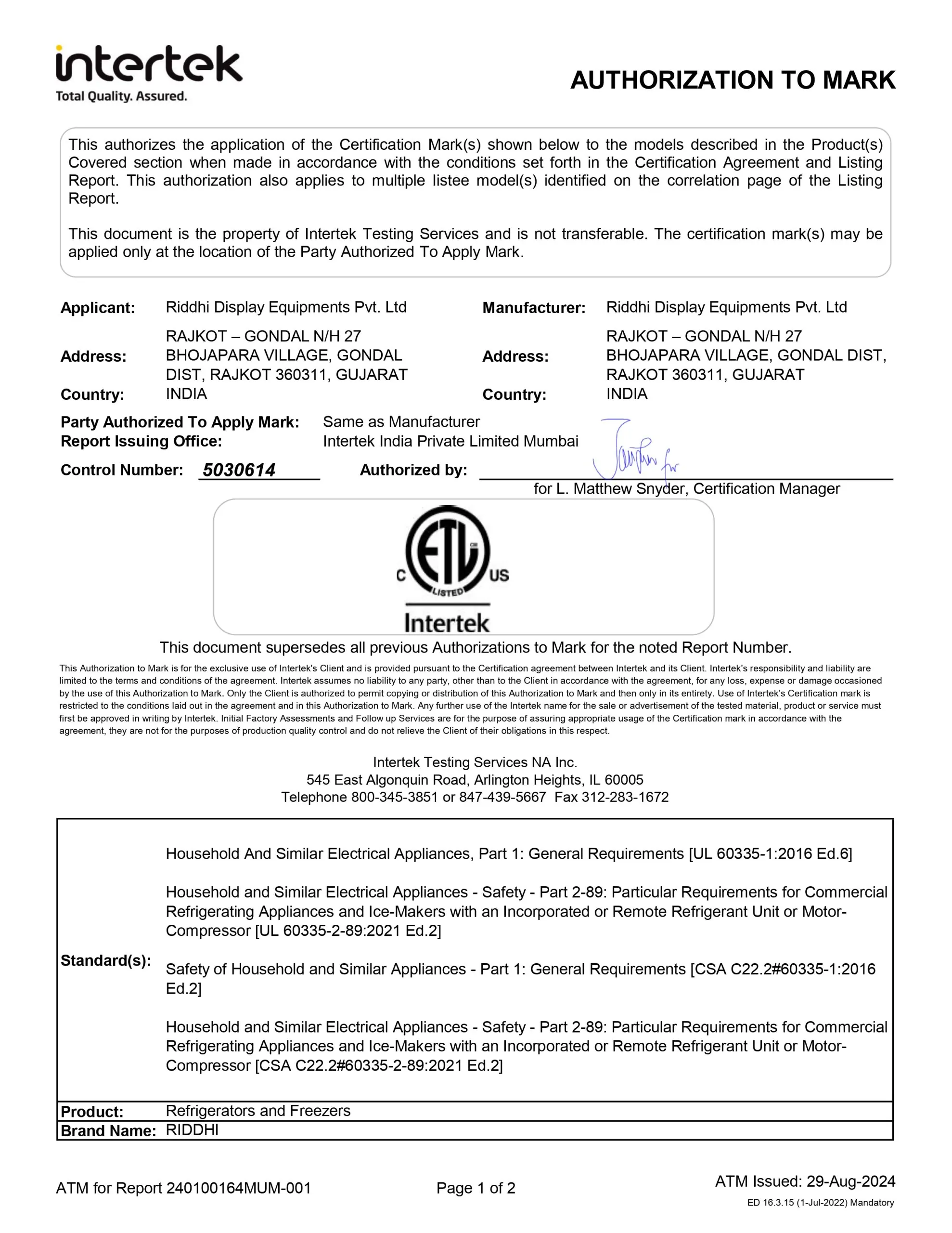 Our Company is ISO 9001:2015 certified and is led by an experienced board of directors, and a professional and experienced management team with extensive experience manufacturing of Display counters, Refrigeration Equipments and Kitchen Equipment. Further our company has obtained an ETL Certification as an “Authorization of Mark” in accordance with the Standards of Export in the USA and Canada.